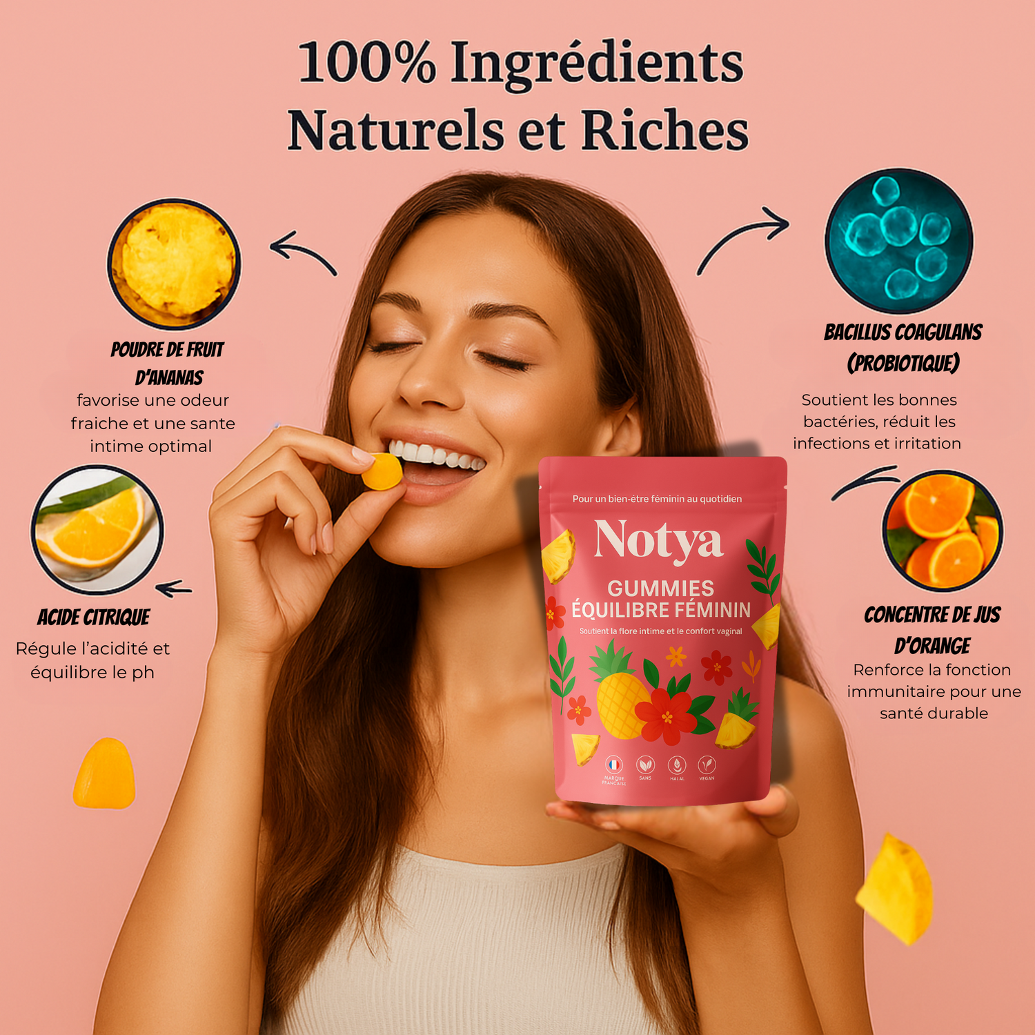 Délicieusement fruitées, incroyablement efficaces ! Nos gummies, à la douce saveur d’ananas, offrent une solution complète pour rééquilibrer votre santé intime, booster votre confiance et illuminer votre quotidien. Conçues pour répondre aux besoins des femmes modernes, elles combinent plaisir et bien-être.